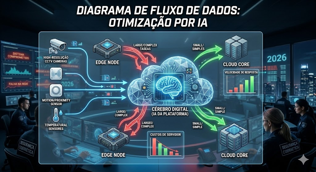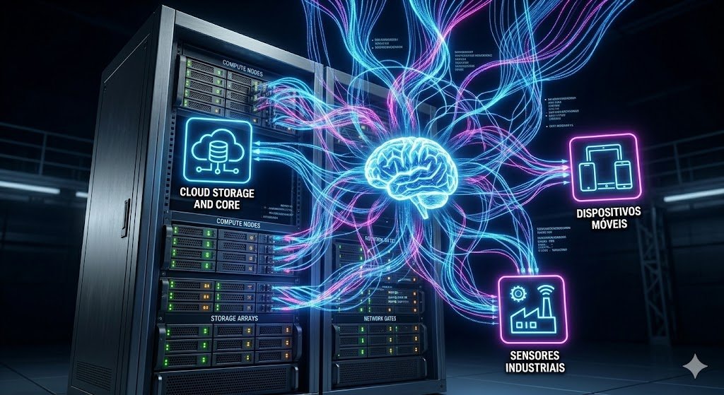 No modelo antigo, você precisaria de uma equipe inteira só para gerenciar onde o processamento de vídeo ocorreria. Com uma Plataforma Definida por IA, o sistema percebe automaticamente que enviar vídeos pesados da fazenda para a nuvem 24 horas por dia é caro e lento. A própria plataforma reconfigura a arquitetura: ela “empurra” o processamento pesado de inferência visual para a Borda (Edge Computing), rodando direto nos equipamentos locais da fazenda, e envia para a nuvem apenas os metadados levinhos (como o peso calculado e alertas de saúde). Tudo isso de forma autônoma.
