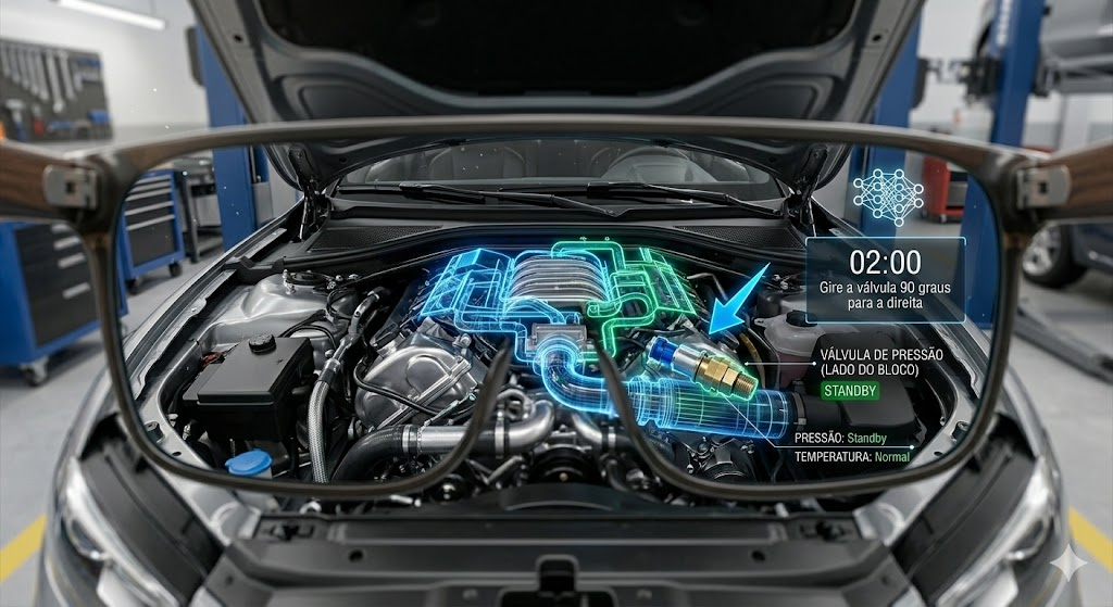 “Visão em primeira pessoa de um tutorial de mecânica sobreposto no mundo real através de Óculos de Realidade Aumentada.